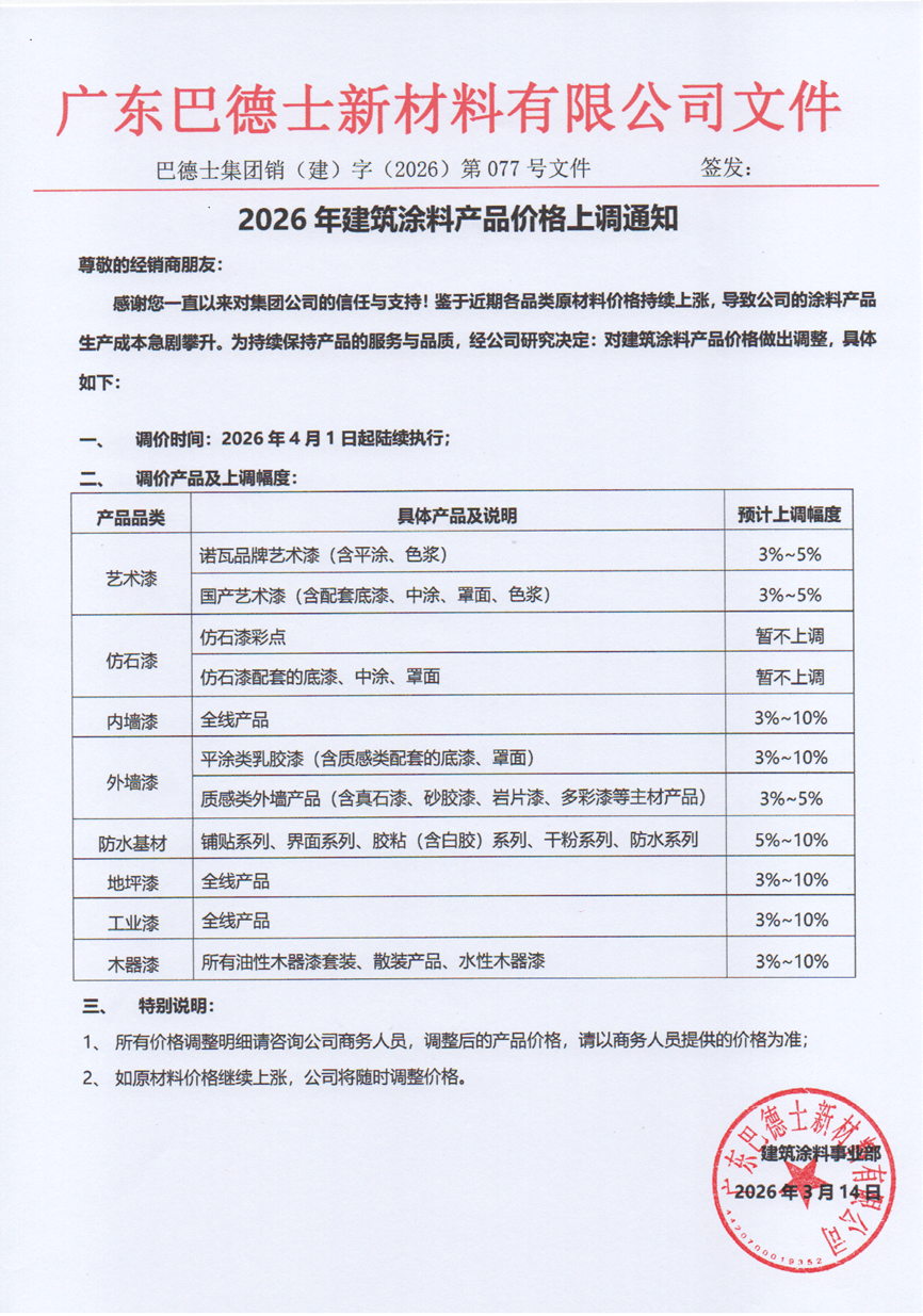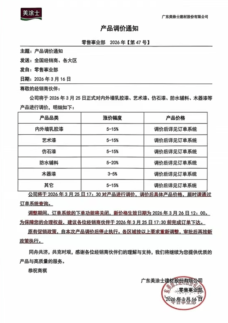 美涂士于3月16日发布调价通知,明白将于3月25日17!30起实施新价钱。具体调整如下:表里墙乳胶漆、艺术漆、仿石漆上涨5-15%,防水辅料涨幅较大,达5-20%,木器漆相对暖和,上涨3-5%,其他产物上涨5-15%。美涂士正在通知中经销商正在调价截止前完成下单,并颁布发表原有促销政策同步终止,显示出其清理旧库存、驱逐新价钱系统的决心。