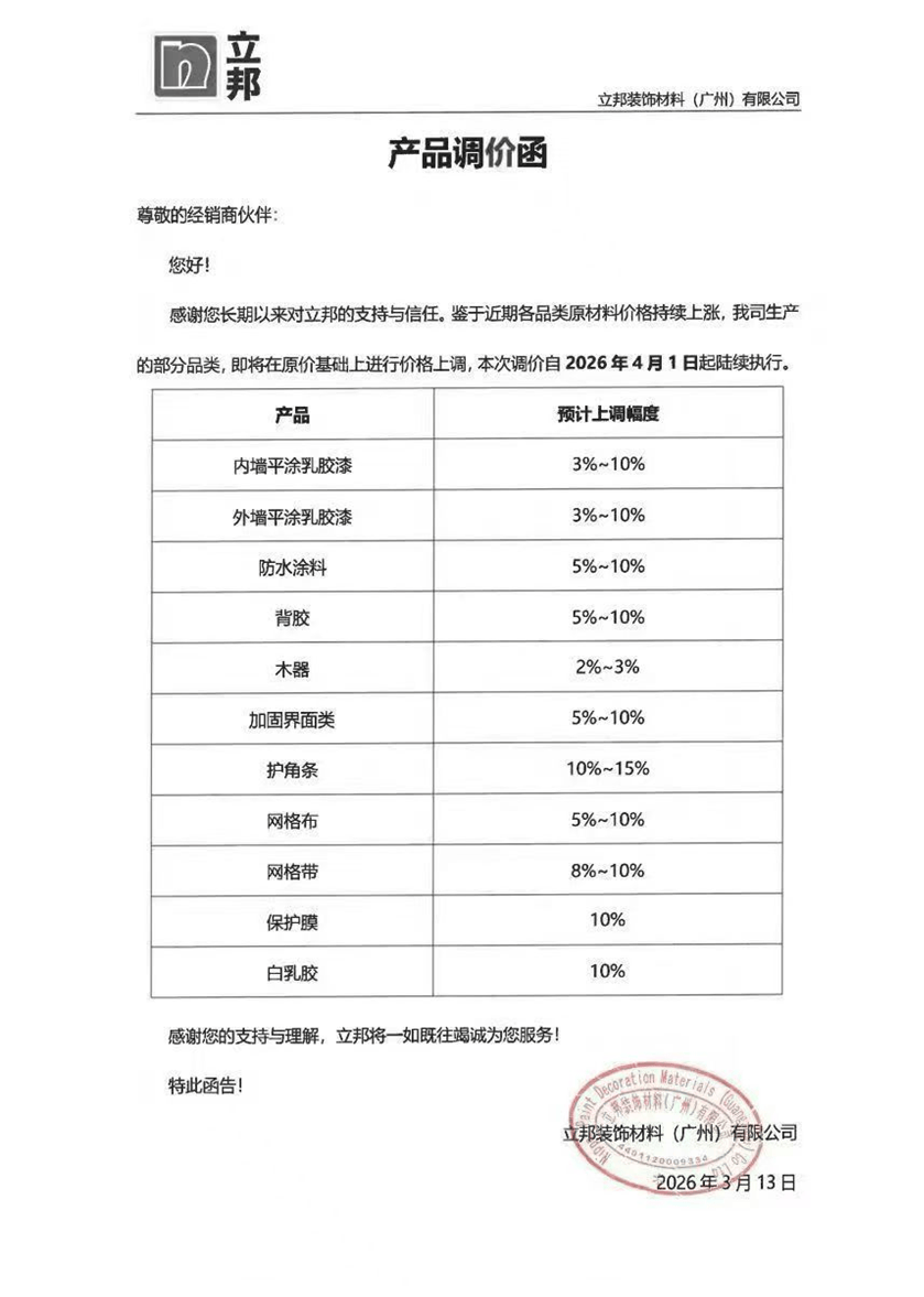 行业巨头立邦粉饰材料(广州)无限公司于3月13日颁布发表,自4月1日起启动价钱调整。此中,内墙及外墙平涂乳胶漆上调3%-10%,防水涂料、背胶等上调5%-10%。辅材方面,护角条上调幅度高达10%-15%,膜取白乳胶上调10%,木器类产物微调2%-3%。立邦的精细化调价策略,表现了其对分歧细分产物线成本布局的精准把控。