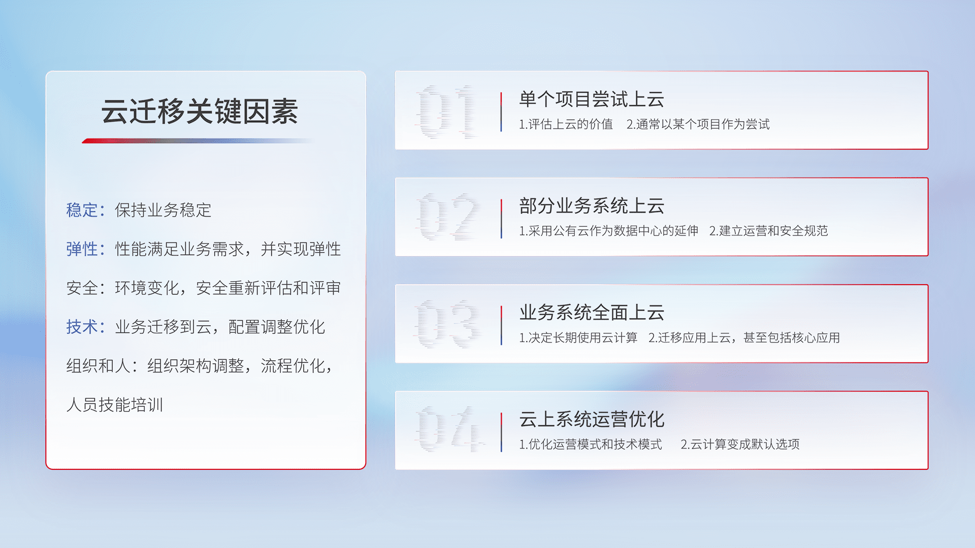 结合实际业务,,从规划设计、、、云平台选型、、、云原生改造、、、、数据迁移、、、集成交付,,,迁移全过程为客户识别最佳上云路径,,,,做好风险识别管理,,,,设计网络架构、、、、身份权限、、、安全审计合规、、、操作审计、、日志审计、、、监控告警策略、、多站点容灾设计等,,对云上基础设施进行整体规划,,,提升IT治理水平,,,,以满足弹性、、、高可用、、、、高性能的需求。。。