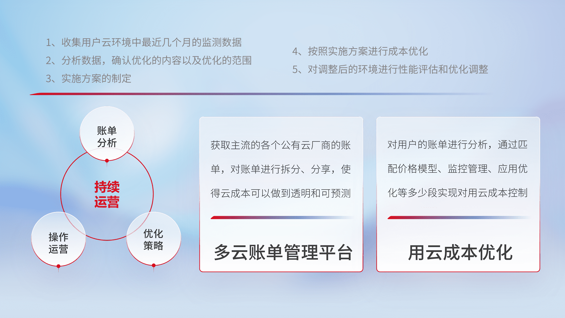 通过多云纳管,,,以统一的资源数据模型把客户的云资源进行抽象和封装,,进而实现对多云资源的统一操作,,,保障云资源管理的可靠性、、、、稳定性与可用性。。。。量身定制化运维内容,,配置、、、、开发运维、、、补丁管理、、、备份、、、监控、、、、认证和访问管理、、审计和日常巡检等,,保障在用云过程中的可靠度,,,稳定度以及高可用率。。。