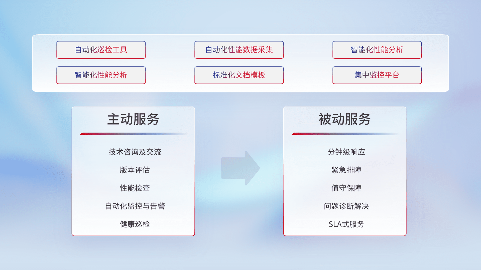 智能化工具和标准化文档,,保障服务质量,,提供主动服务(包含技术咨询、、、版本评估、、性能检查、、自动化监控与告警、、健康巡检)和被动服务包含(分钟级响应、、、紧急排障、、、、值守保障、、、、问题诊断解决、、SLA服务)。。。